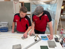 Für eine Woche wurde die SCHLÜTER WORKBOX zum Trainingsort – in zwei separaten Räumen absolvierte die Fliesen-Nationalmannschaft ihre Wettbewerbswoche, eingeteilt in Zweierteams. 24 Stunden hatten sie Zeit für eine komplexe Aufgabe, die einen starken Praxisbezug aufwies. „Ursprünglich wollten wir dafür nur 22 Stunden vorgeben – wie es bei den WorldSkills üblich ist“, erklärt Bundestrainer Marcel Beyer, „aber wegen der anspruchsvollen Aufgabe entschieden wir uns, die Zeitvorgabe für dieses Modul zu erhöhen.“