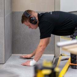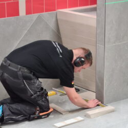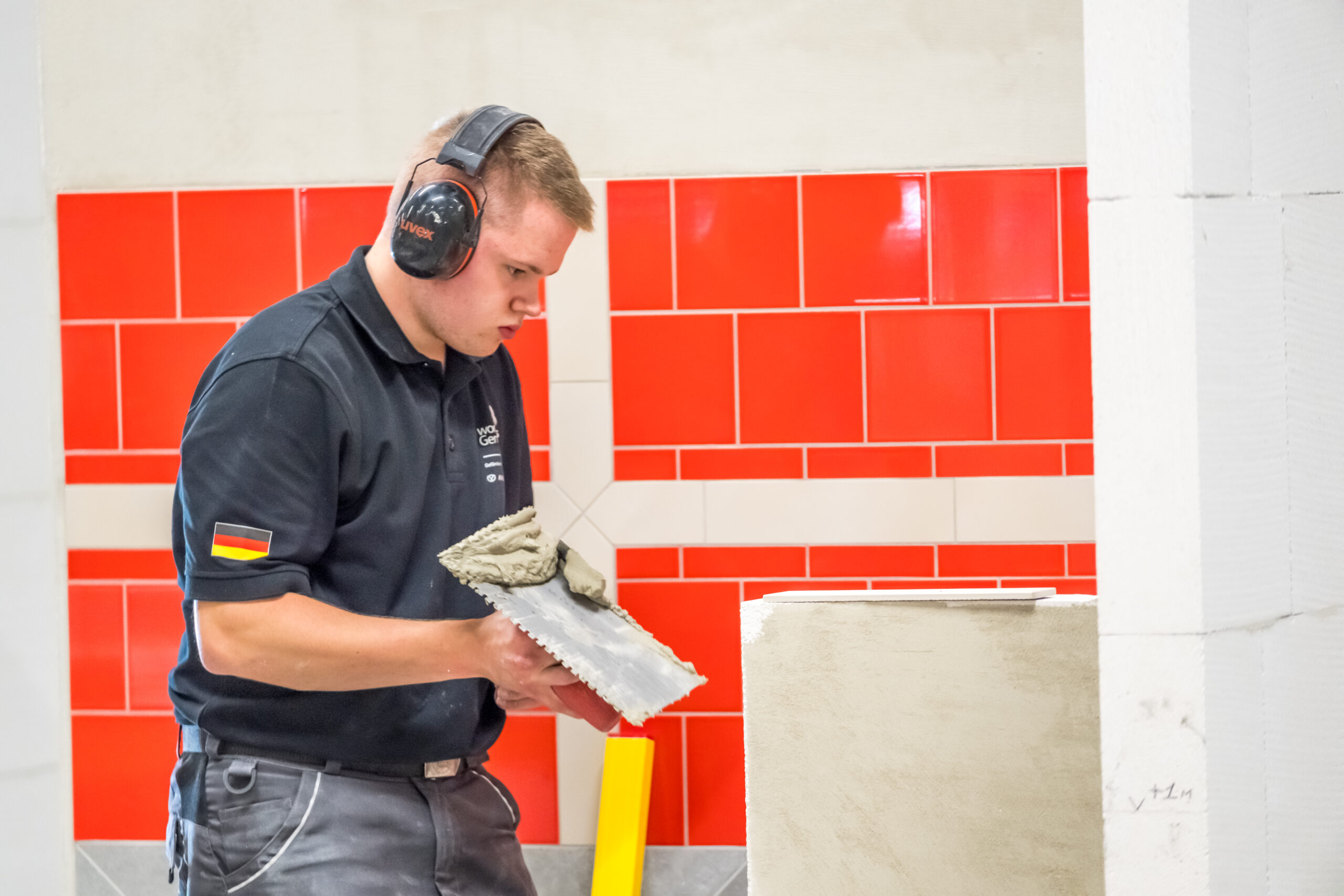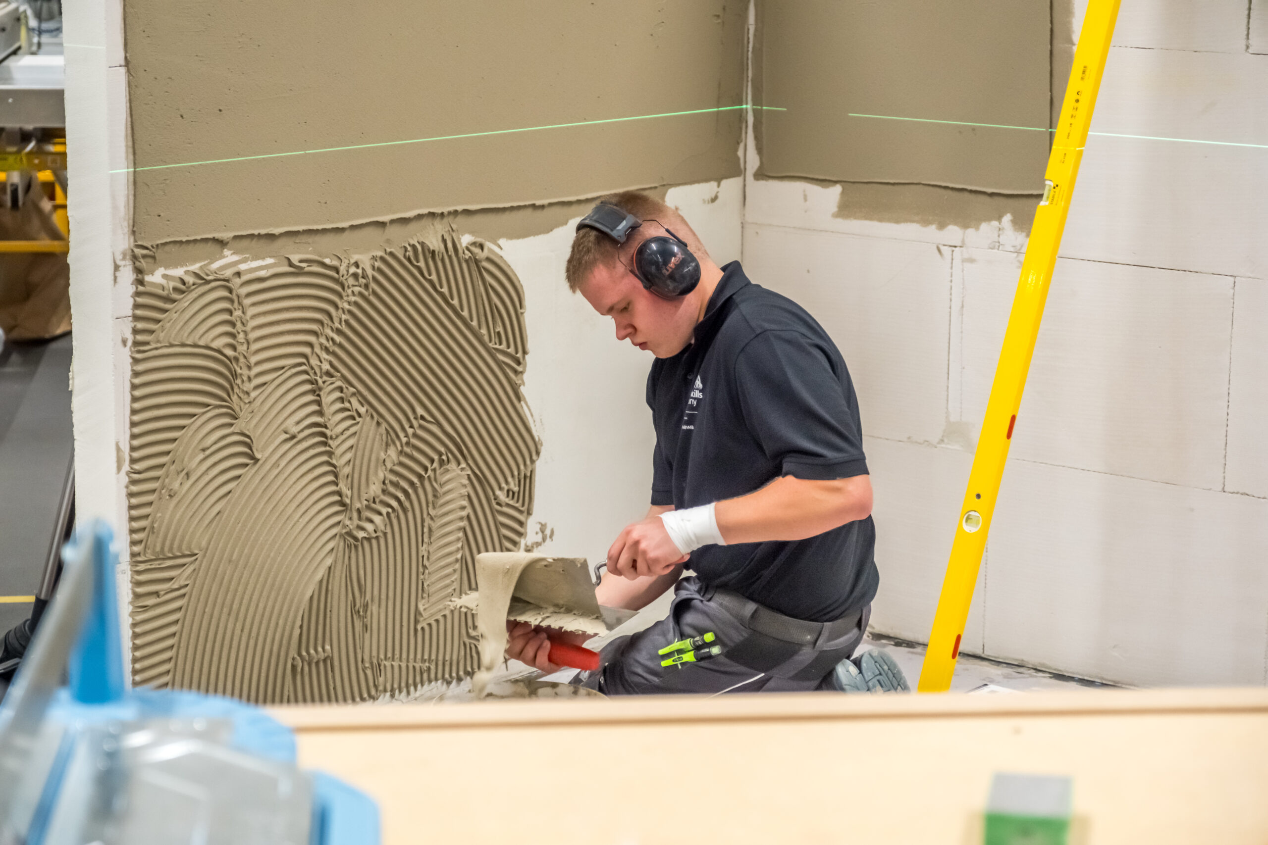 Zwei Wände mussten die Teilnehmer gestalten, dazu eine Trennwand mauern, einen Waschtisch konstruieren und Gefälle einbauen. Beide Wände fliesten sie mit Fliesen in unterschiedlichen Maßen und Stärken. „Besonders die dänische Flagge wurde zur Herausforderung“, erklärt der Bundestrainer, „die roten und weißen Fliesen waren verschieden, daher musste der Untergrund ausgeglichen werden.“ 19,5 Stunden hatten Luis Brauner und seine Konkurrenten für das gesamte Werkstück Zeit.
