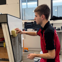 Für eine Woche wurde die SCHLÜTER WORKBOX zum Trainingsort – in zwei separaten Räumen absolvierte die Fliesen-Nationalmannschaft ihre Wettbewerbswoche, eingeteilt in Zweierteams. 24 Stunden hatten sie Zeit für eine komplexe Aufgabe, die einen starken Praxisbezug aufwies. „Ursprünglich wollten wir dafür nur 22 Stunden vorgeben – wie es bei den WorldSkills üblich ist“, erklärt Bundestrainer Marcel Beyer, „aber wegen der anspruchsvollen Aufgabe entschieden wir uns, die Zeitvorgabe für dieses Modul zu erhöhen.“