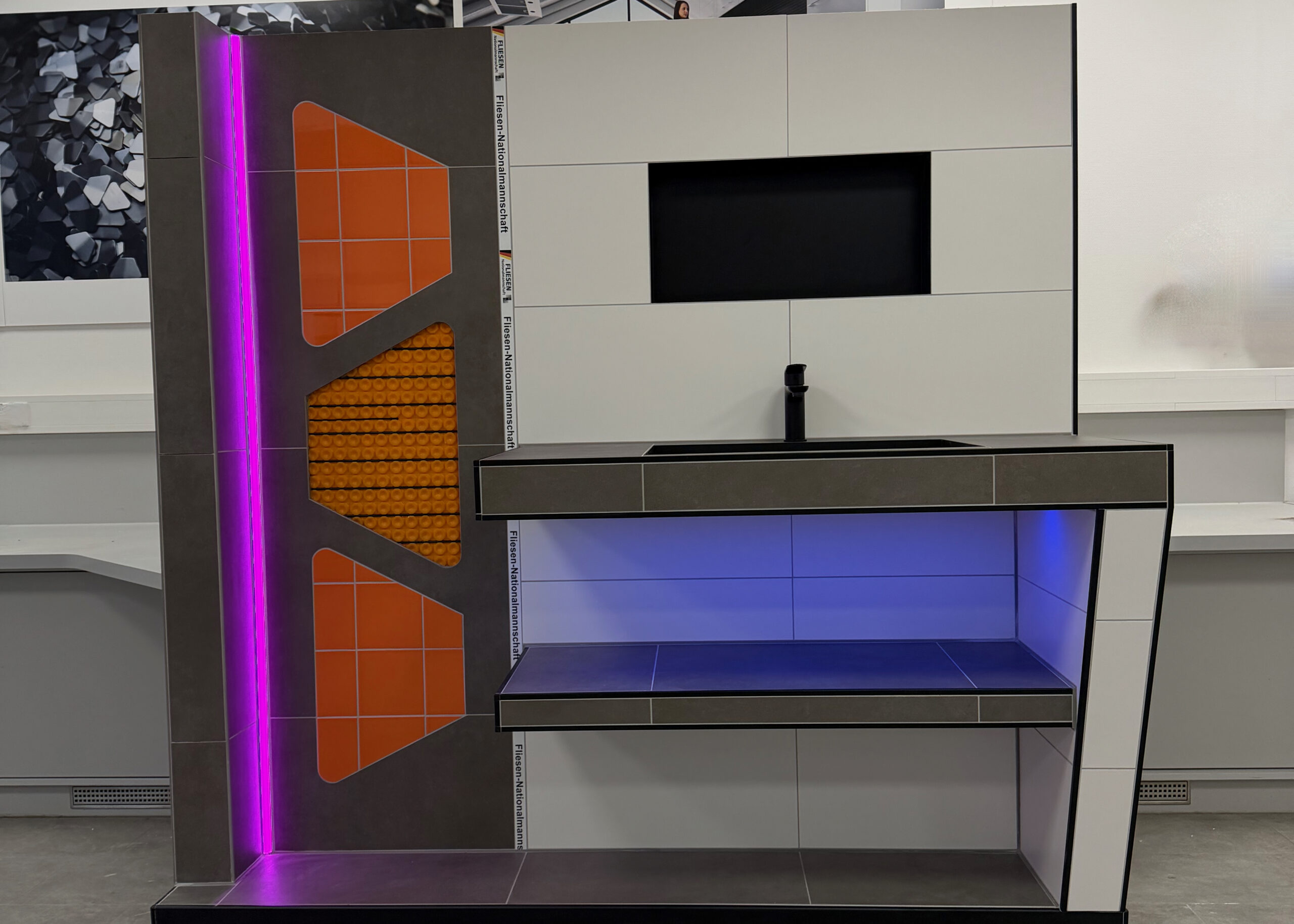 Erstellt werden musste eine Wand, in die einige SCHLÜTER-Produkte eingebaut werden sollten wie zum Beispiel die QUADEC-Schienen und die Lichtprofile der LIPROTEC-Reihe. Zudem bekam die „Waschwand“ eine DITRA-HEAT-Wandflächenheizung, die durch das Unternehmenslogo führte. Gebaut werden musste ein Waschtisch mit einer Ablage darunter, rechts davon der schräg hochlaufende Fuß, darüber eine Nische. „Die Wand haben wir in zwei Bereiche eingeteilt, die durch ein Bordürenprofil getrennt wurden.“ Auch dafür verwendete das Team ein SCHLÜTER-Produkt: die DESIGNLINE, exklusiv versehen mit der Wort-Bild-Marke der Fliesen-Nationalmannschaft.