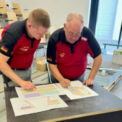 „Ich habe nach dieser Woche erkannt, dass ich mit der richtigen Vorbereitung deutlich effizienter arbeiten kann“, meint Luis Brauner, „diese Erkenntnis ist wichtig auf den Wettbewerb.“ Dem stimmt Teammanager Beyer zu, „Luis könnte sich mit einem zielgerichtet-durchdachten Konzept als Arbeitsgrundlage entscheidende Vorteile erarbeiten“. Seit Januar 2024 ist Luis Brauner Mitglied der Fliesen-Nationalmannschaft. Nach dem fünften Platz bei den GermanSkills 2024 holte er sich diese Saison souverän den Sieg im Gesamtklassement. Als NRW-Landessieger 2023 und Zweiter bei den Deutschen Meisterschaften hatte er mit der Aufnahme ins Team seine Ziele formuliert, „ich möchte unbedingt zur Europameisterschaft und Weltmeisterschaft!“. Den ersten Schritt hat der 21-Jährige mit der Qualifikation zur EM in Dänemark geschafft.